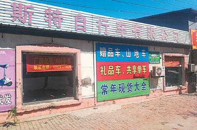 天津市武清區(qū)王慶坨鎮(zhèn)曾以生產(chǎn)共享單車(chē)聞名,如今鎮(zhèn)上店面內(nèi)已難覓共享單車(chē)的蹤影。圖為路邊貼著共享單車(chē)標(biāo)語(yǔ)的自行車(chē)店,店內(nèi)空無(wú)一人,櫥窗玻璃上貼著“廠房出租”的字樣。(本報(bào)記者孔德晨攝)