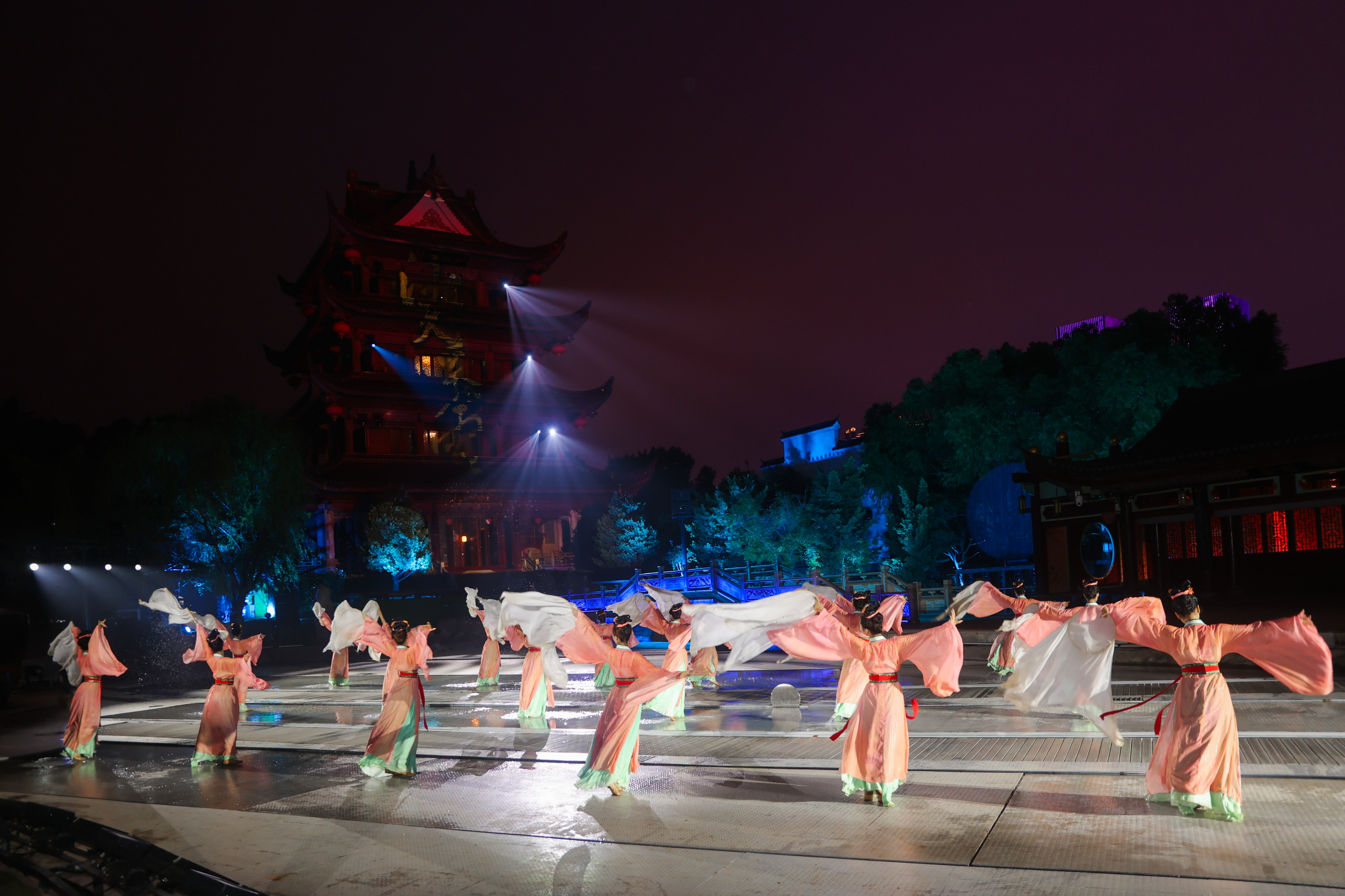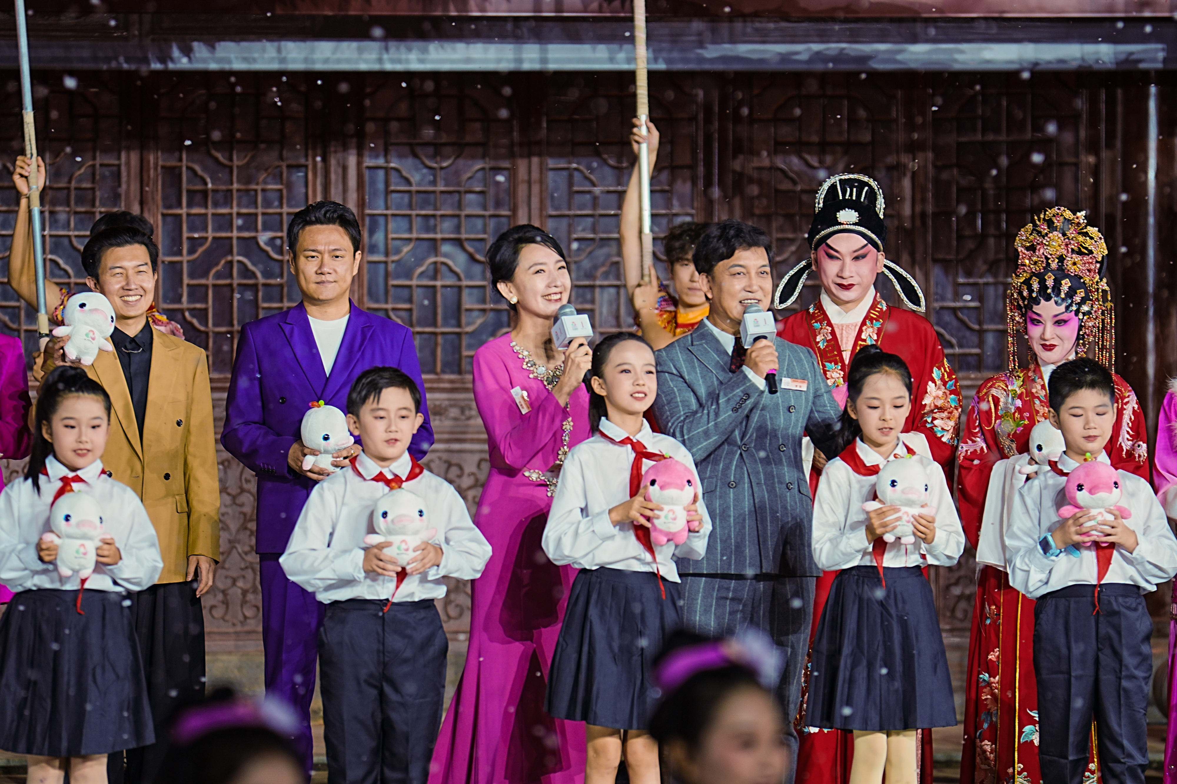 夜幕降臨,由湖南華夏集團(tuán)全新打造的江天暮雪光影劇場(chǎng)流光溢彩?!皟汕橄婊浫\(yùn)接棒”主題活動(dòng)如約啟幕。