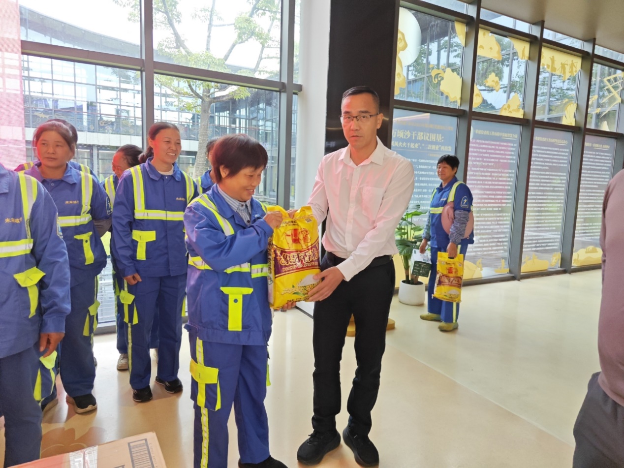 與此同時,在新墾圍墾陳列館開設(shè)宣傳攤位,向環(huán)衛(wèi)工人進(jìn)行相關(guān)生活垃圾分類知識宣傳并派發(fā)暖心慰問禮品。