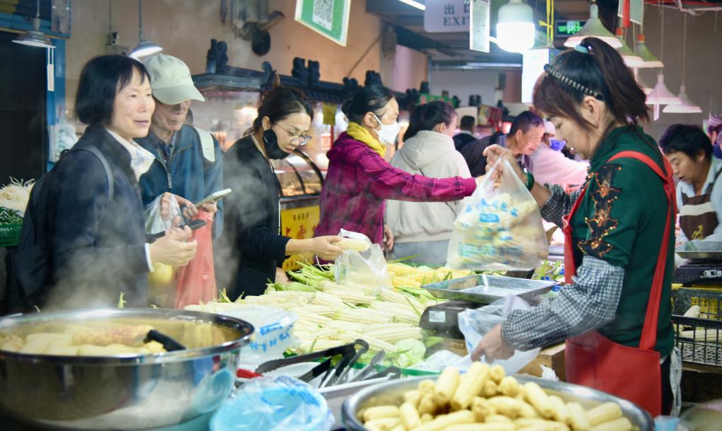??10月28日,昆明市五里多農(nóng)博廣場內(nèi),顧客在攤位前選購玉米。新華社記者王賢思 攝
