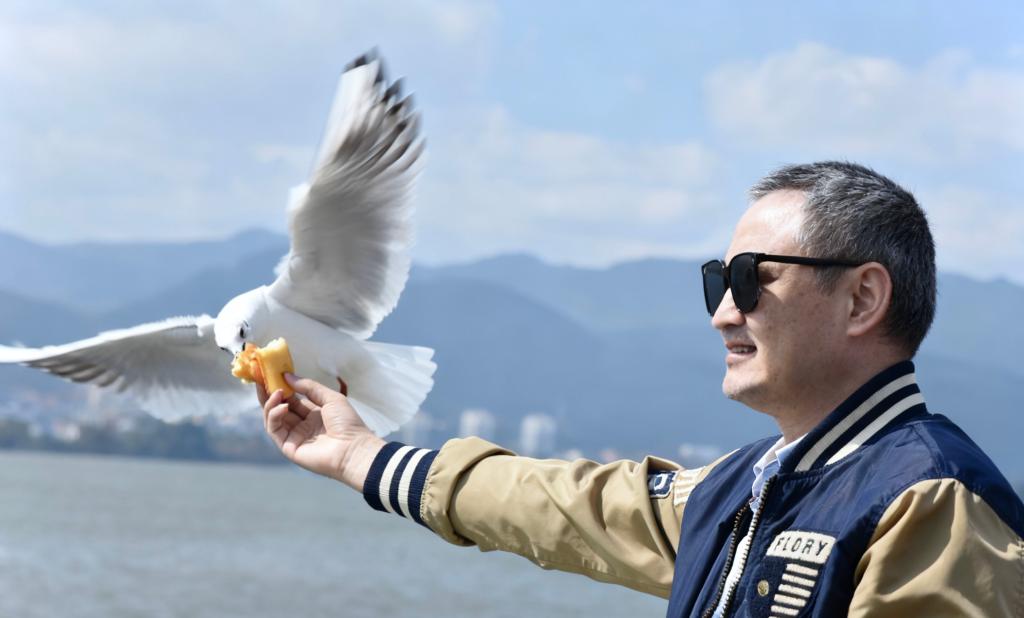 ??10月28日,昆明滇池邊海埂大壩上,游客在喂食紅嘴鷗。新華社記者王賢思 攝