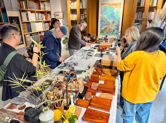 在永嘉巖頭鎮(zhèn)阿勇字畫裝裱店內,藝術家們咨詢裝裱工藝,一行人將小店擠得水泄不通,老板娘熱情回應介紹,互加微信。