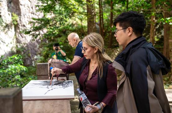 在楠溪江獅子巖,兩國藝術家合作山水畫,東方山水美學與西方藝術理念碰撞融合?!坝弥袊L畫表現(xiàn),有淡淡的水墨韻味,和水彩畫筆比較,變化很微妙?!卑矕|尼·邁克爾迪斯第一次嘗試用毛筆,思考著如何將見到的壯闊天地,轉化為中式筆下的意境流轉。
