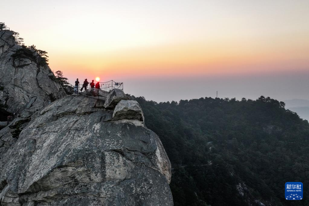 10月9日清晨,幾名游客在龜峰山觀日出(無人機照片)。