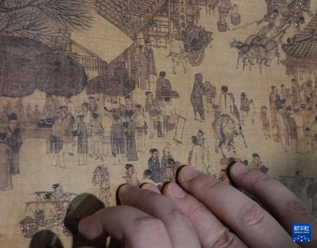 10月13日,視障人士在發(fā)布會(huì)后,欣賞無障礙版《觸摸<清明上河圖>》。
