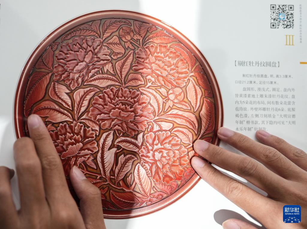 10月13日,視障人士在發(fā)布會(huì)后,欣賞無障礙版《觸摸故宮珍寶》中的剔紅牡丹紋圓盤。