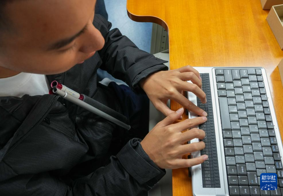 10月13日,視障人士在發(fā)布會(huì)后,體驗(yàn)有點(diǎn)顯器的盲文筆記本電腦。