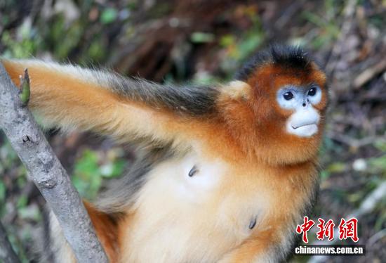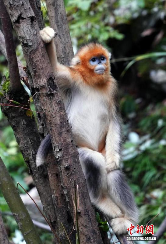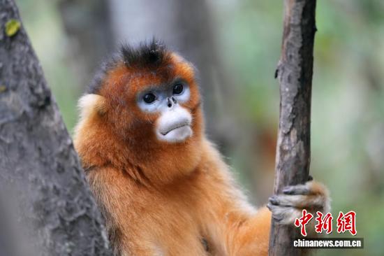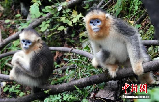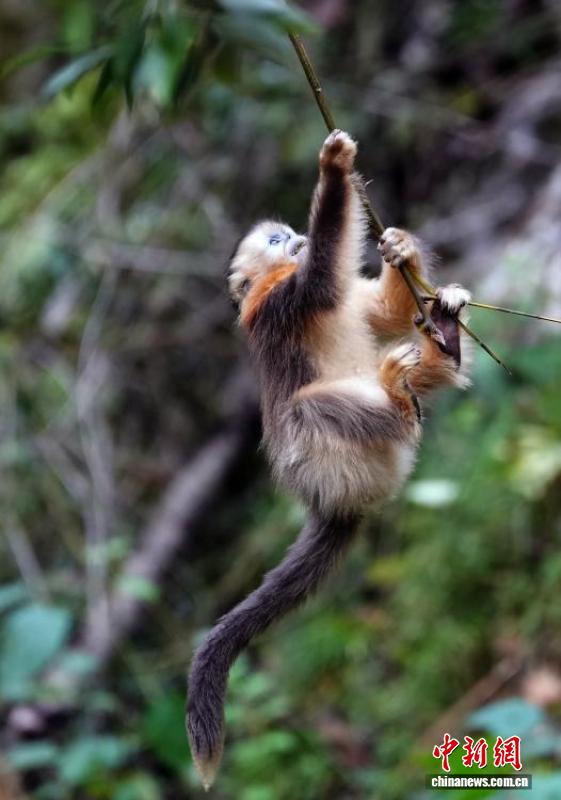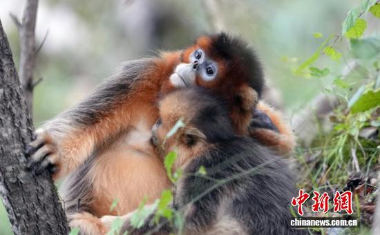 10月12日,在位于四川省阿壩藏族羌族自治州九寨溝縣境內(nèi)的白河金猴谷景區(qū)里,生活著約1700只野生川金絲猴,這些面頰呈淡藍(lán)色,全身金黃、毛發(fā)油亮的川金絲猴在層巒疊翠的山林峽谷玩耍,動(dòng)作輕盈、萌態(tài)十足。圖為野生川金絲猴萌態(tài)十足。中新社記者 安源 攝