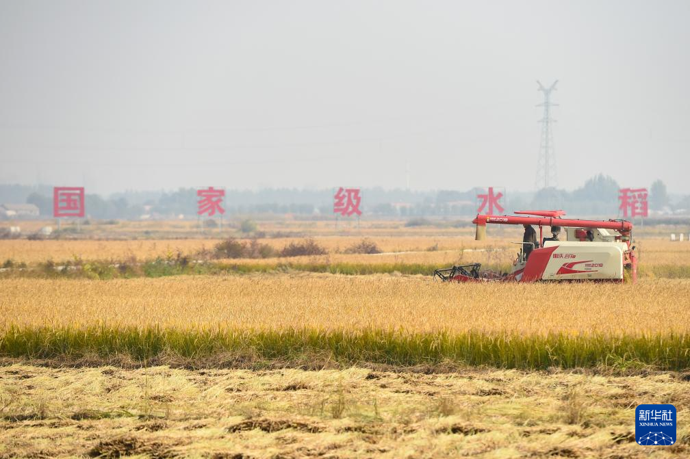 10月14日,在吉林省公主嶺市,農(nóng)民駕駛農(nóng)機收割水稻。