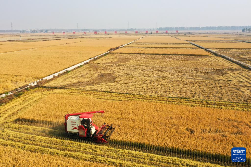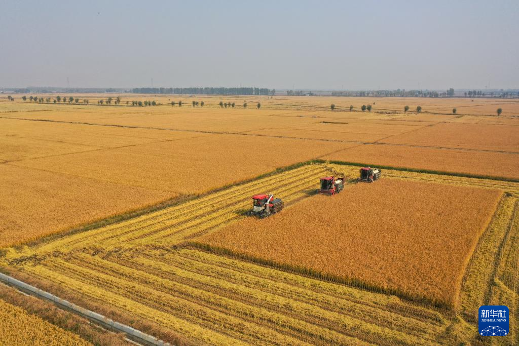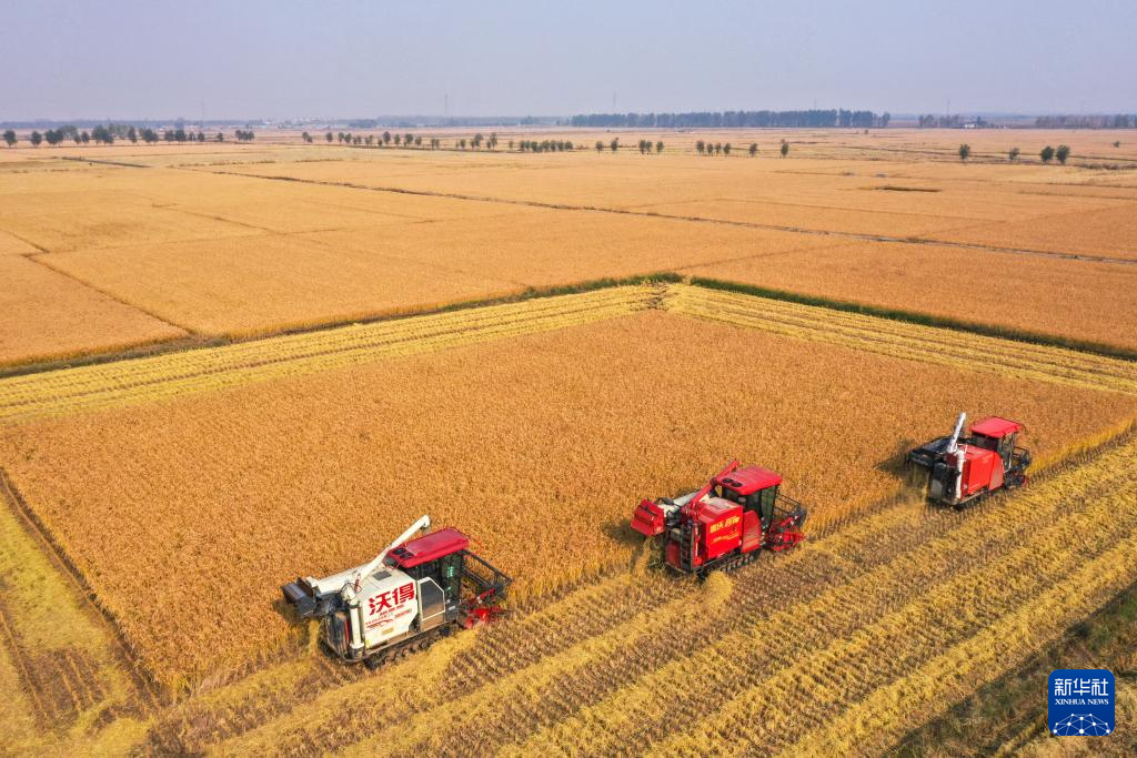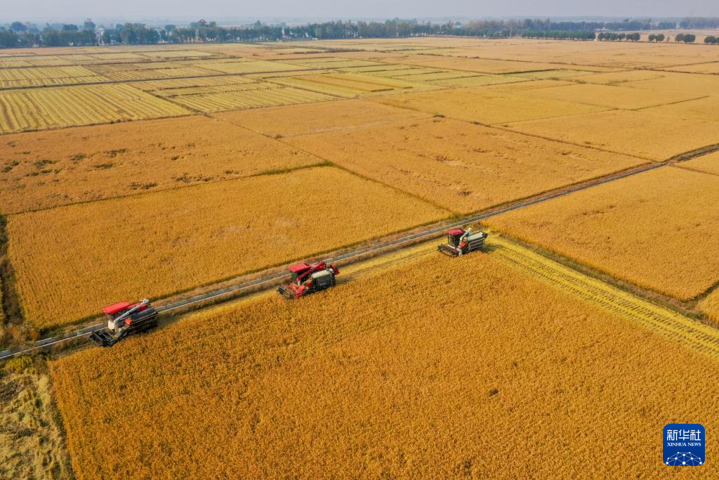 10月14日,在吉林省公主嶺市,吉林省米兜種植農(nóng)民專業(yè)合作社進行機械化收割水稻作業(yè)展示(無人機照片)。