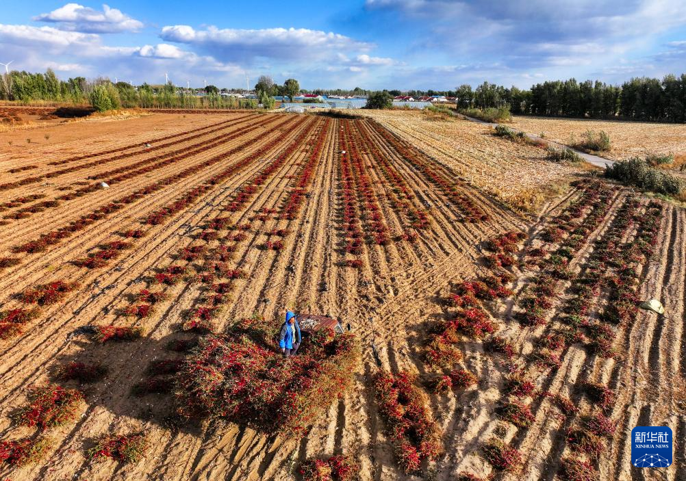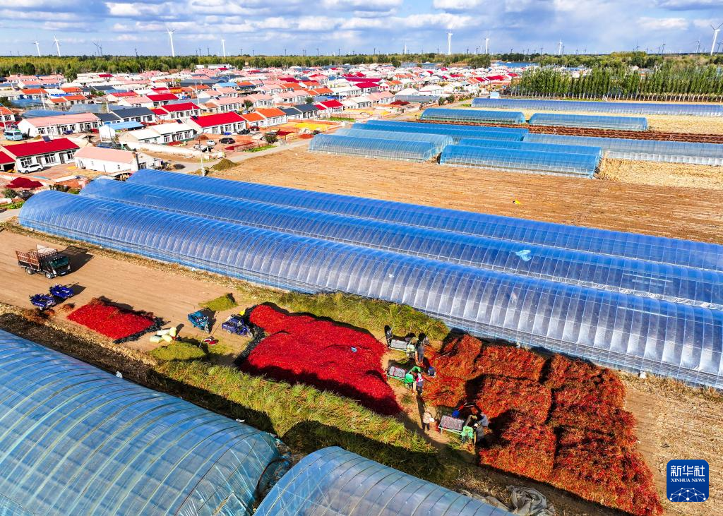 10月19日,在通遼市開魯縣東風(fēng)鎮(zhèn)六合堂村,村民在田地里晾曬紅干椒。