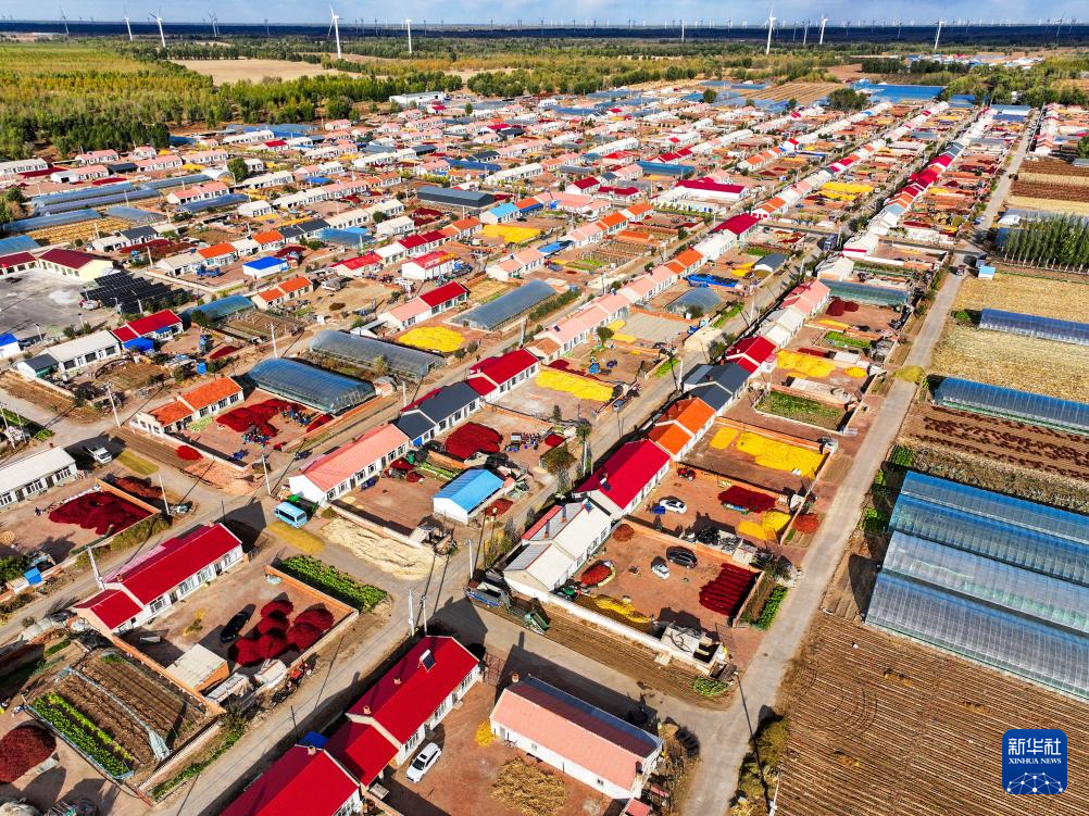 10月19日,在通遼市開魯縣東風(fēng)鎮(zhèn)六合堂村,家家戶戶的庭院里堆放著收獲的紅干椒(無人機(jī)照片)。