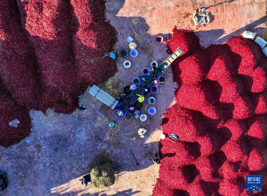 10月19日,在通遼市開魯縣東風(fēng)鎮(zhèn)六合堂村,村民在分揀紅干椒(無人機(jī)照片)。
