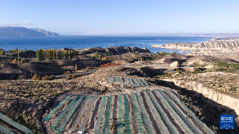 10月18日拍攝于青海省海南藏族自治州共和縣龍羊新村龍羊峽海湖漁業(yè)捕撈合作社的小銀魚晾曬網(wǎng)(無人機(jī)照片)。
