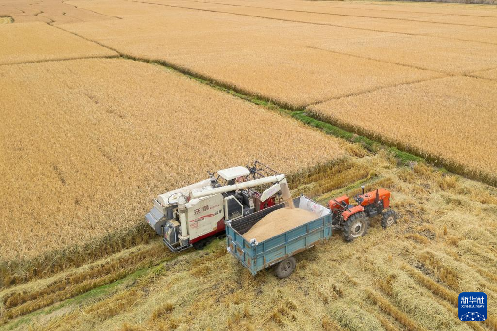 10月14日,在黑龍江省牡丹江市西安區(qū)福興村,村民將收割的水稻裝車(無人機照片)。