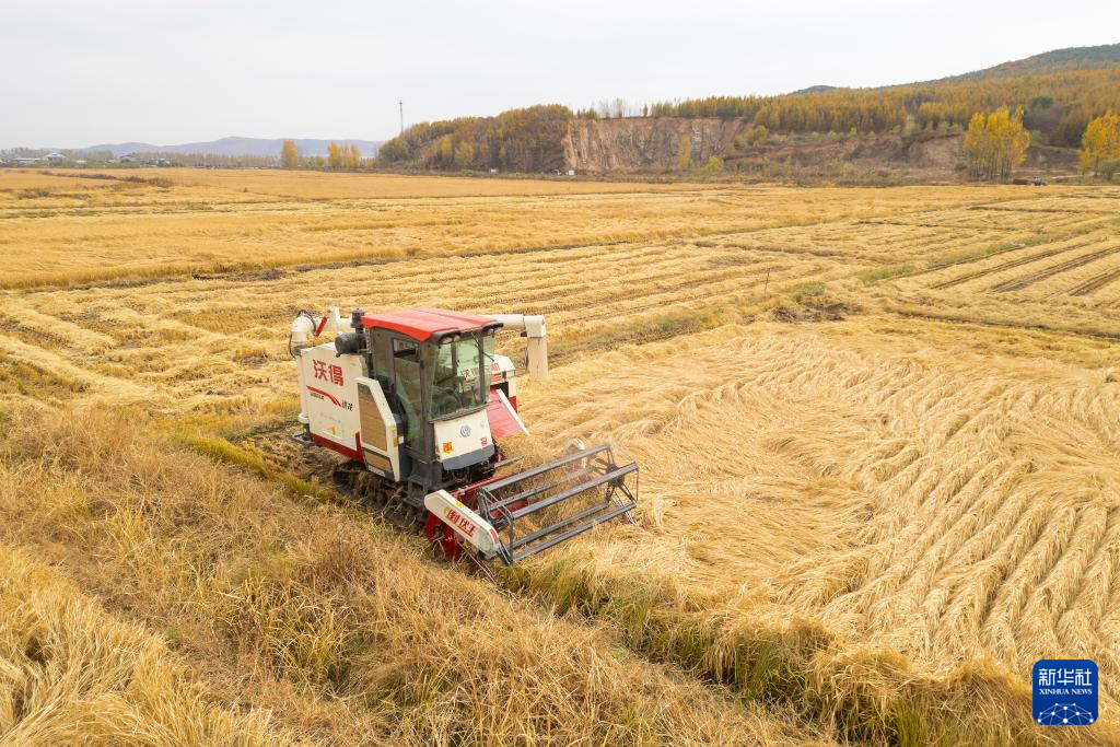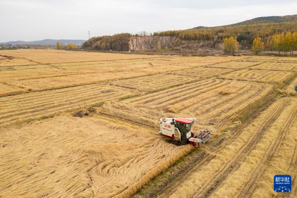 10月14日,在黑龍江省牡丹江市西安區(qū)沙虎村,村民駕駛收割機收割水稻(無人機照片)。