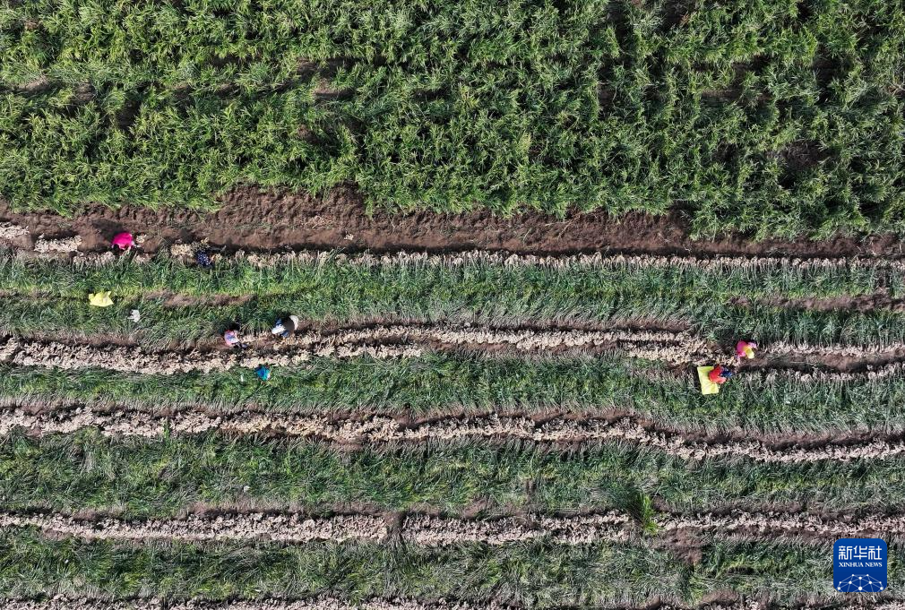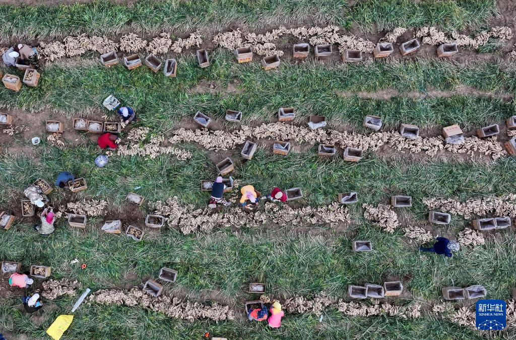 10月26日,河北省唐山市豐南區(qū)大新莊鎮(zhèn)的農(nóng)民在田間收獲生姜(無人機(jī)照片)。