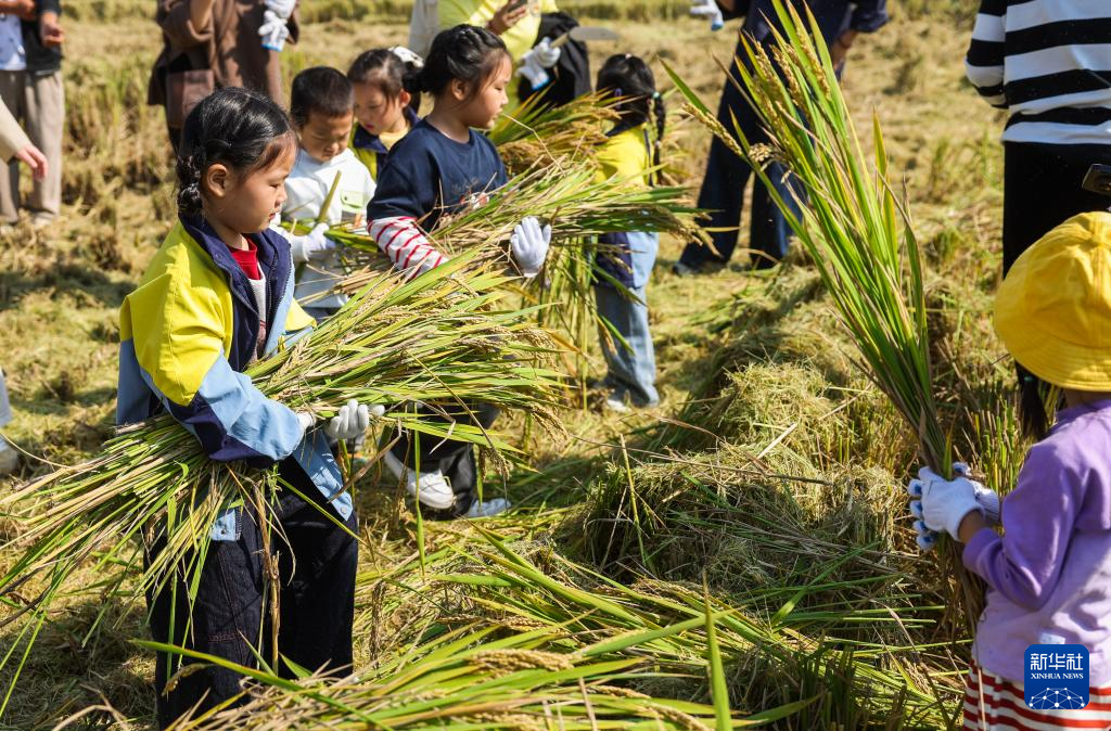 10月29日,東林鎮(zhèn)中心幼兒園的孩子們在老師和家長的帶領(lǐng)下在東林鎮(zhèn)保國村的水稻田里體驗糧食收獲的喜悅。