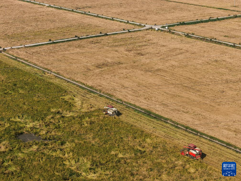 10月29日,收割機在東林鎮(zhèn)保國村的水稻田里收割稻谷(無人機照片)。