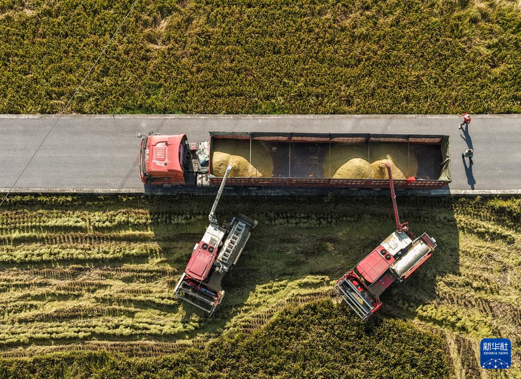 10月29日,工人操作收割機將收獲的稻谷裝車(無人機照片)。