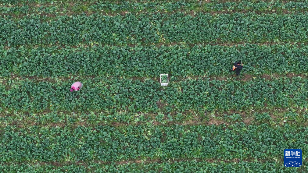 10月30日,菜農(nóng)在沅江市草尾鎮(zhèn)樂園村蔬菜田里采收蔬菜(無人機(jī)照片)。
