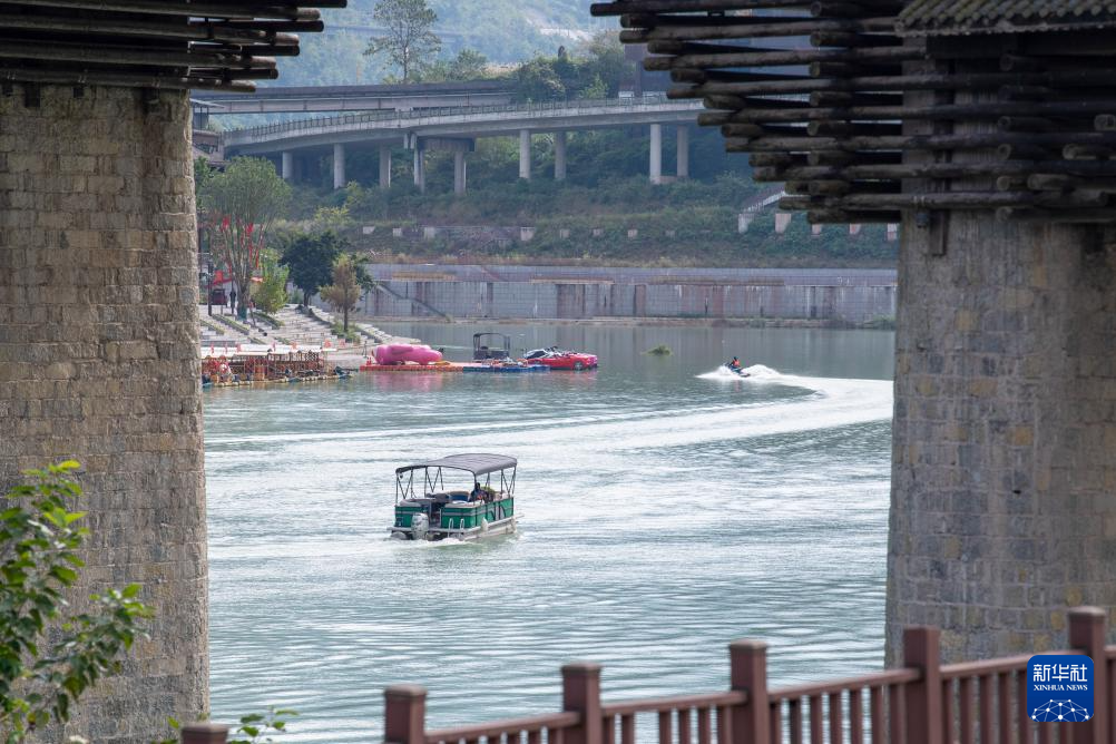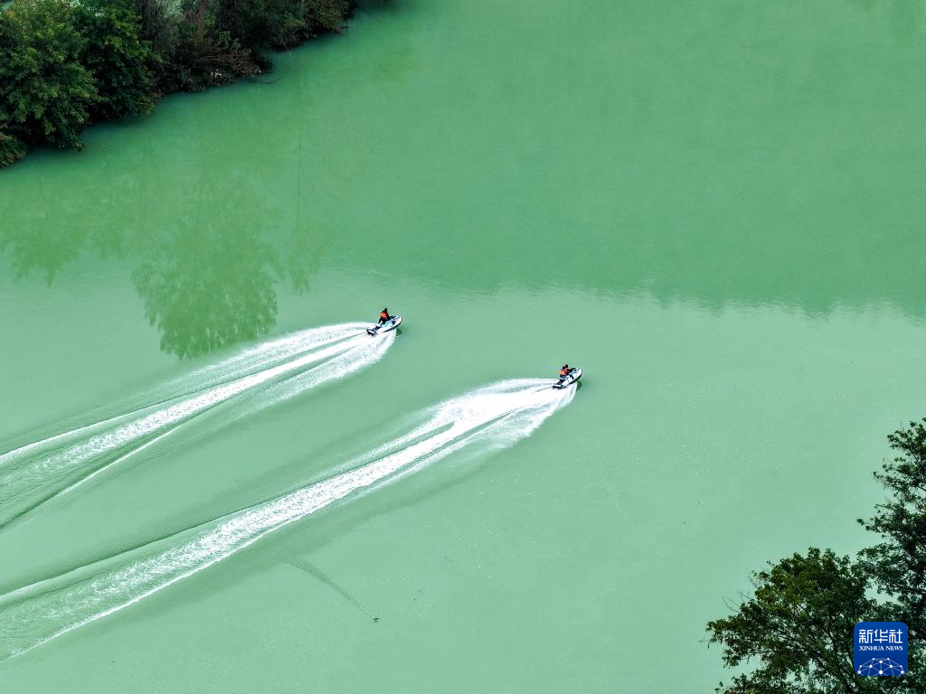 10月30日,水上運動愛好者在濯水古鎮(zhèn)旁的阿蓬江上體驗水上摩托艇(無人機照片)。