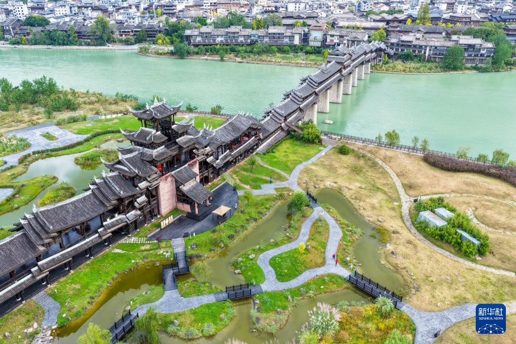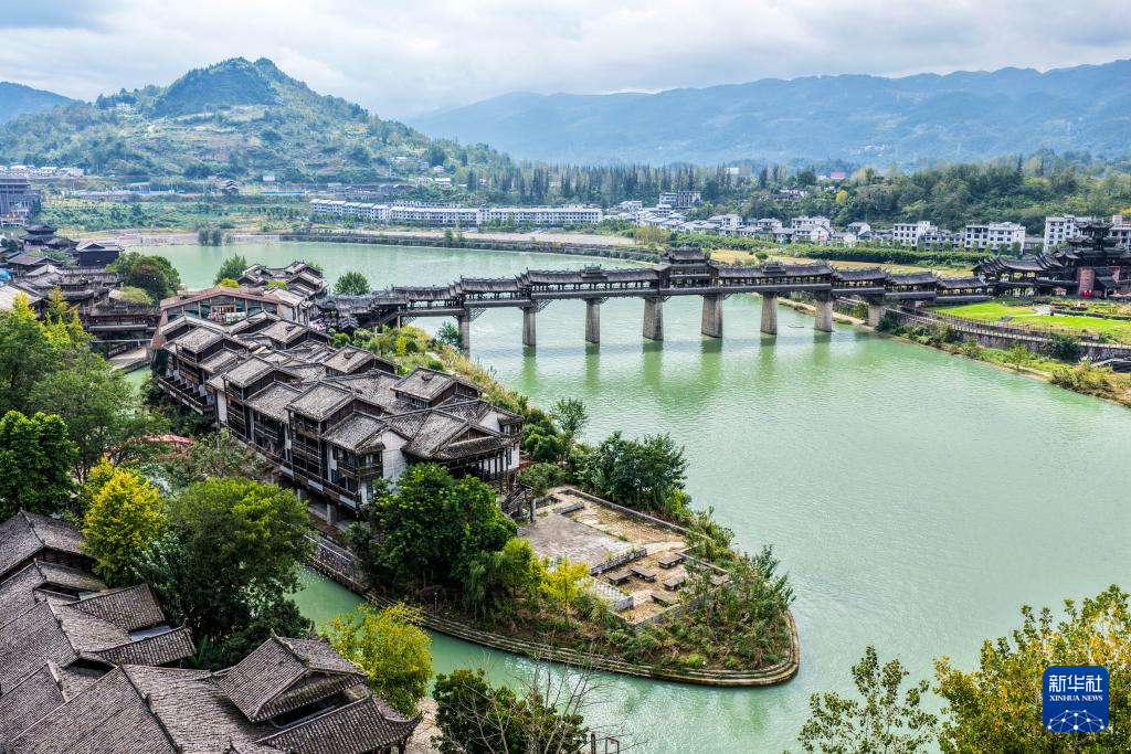這是10月30日拍攝的濯水古鎮(zhèn)和風(fēng)雨廊橋景色(無人機照片)。