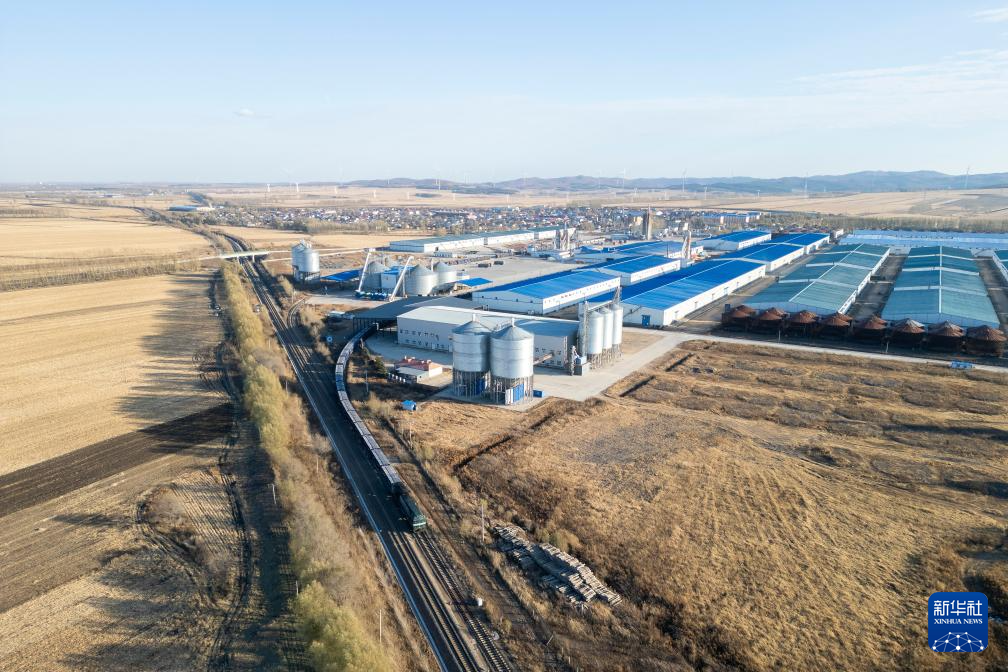 10月31日,在黑龍江省雙鴨山市的中糧天興物流園區(qū)專用線上,一輛滿載糧食的運糧列車駛出(無人機照片)。