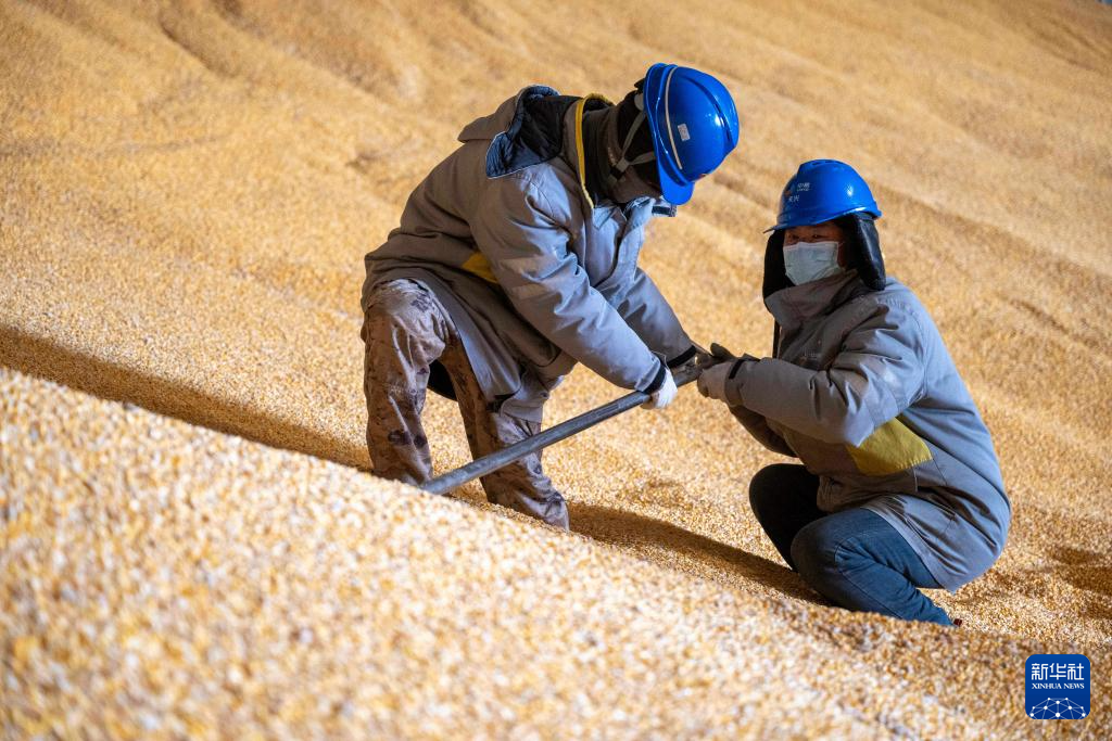 10月31日,在黑龍江省雙鴨山市的中糧天興物流園區(qū)倉儲庫,工人進行扦樣作業(yè),了解儲存?zhèn)}內大豆水分、雜質以及蟲害等情況。