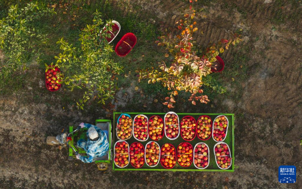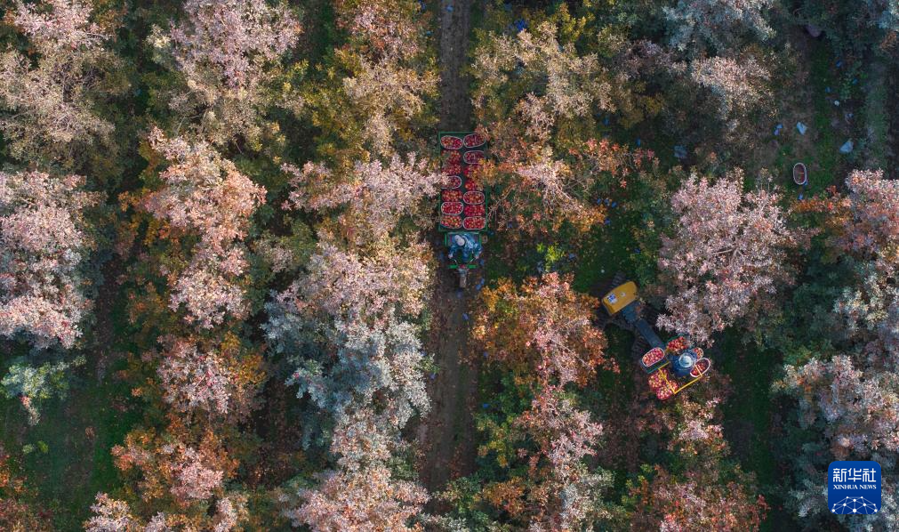 10月23日,在新疆生產(chǎn)建設(shè)兵團(tuán)第一師阿拉爾市六團(tuán)三連蘋果園,林果業(yè)服務(wù)隊(duì)隊(duì)員運(yùn)輸剛采摘的蘋果(無人機(jī)照片)。