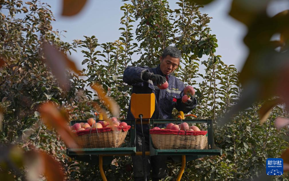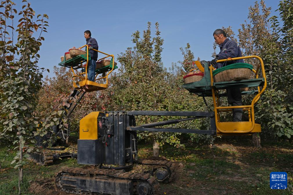 10月23日,在新疆生產(chǎn)建設(shè)兵團(tuán)第一師阿拉爾市六團(tuán)三連蘋果園,林果業(yè)服務(wù)隊(duì)隊(duì)員乘坐智能采摘機(jī)采摘蘋果。