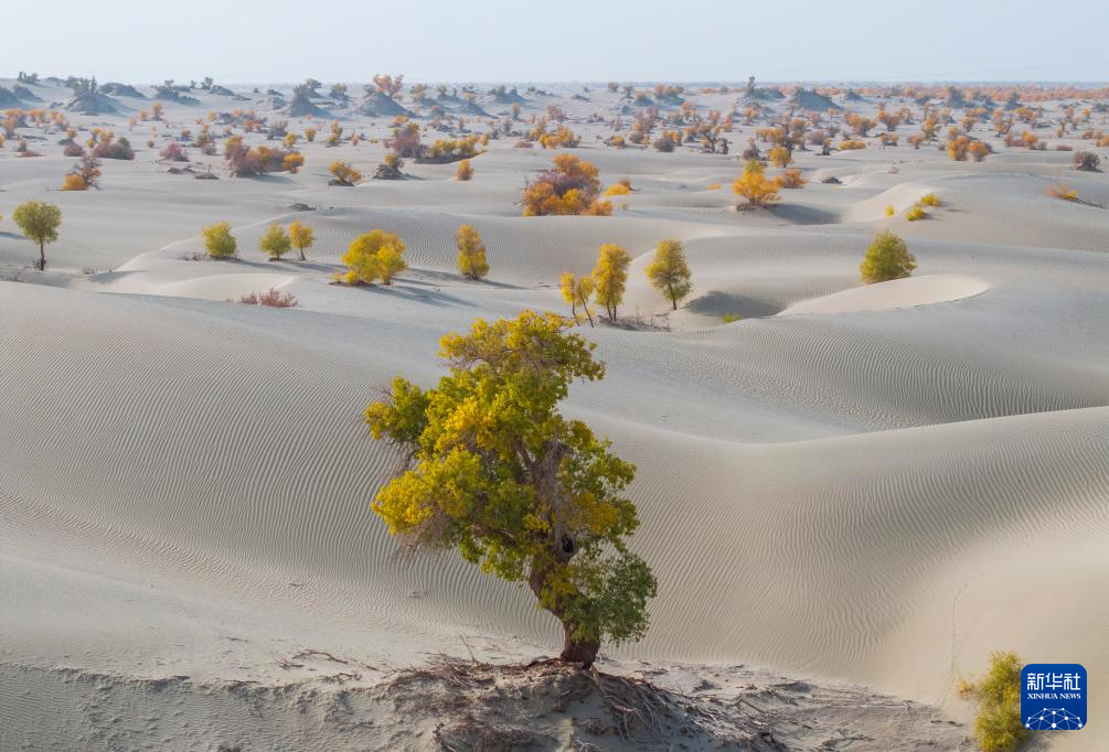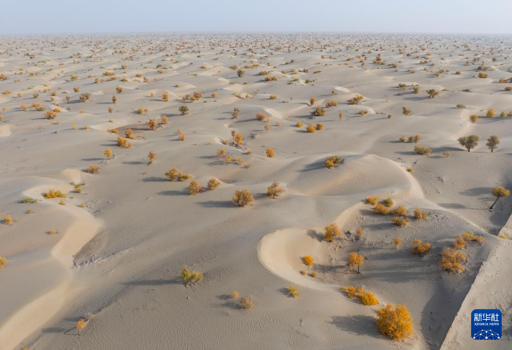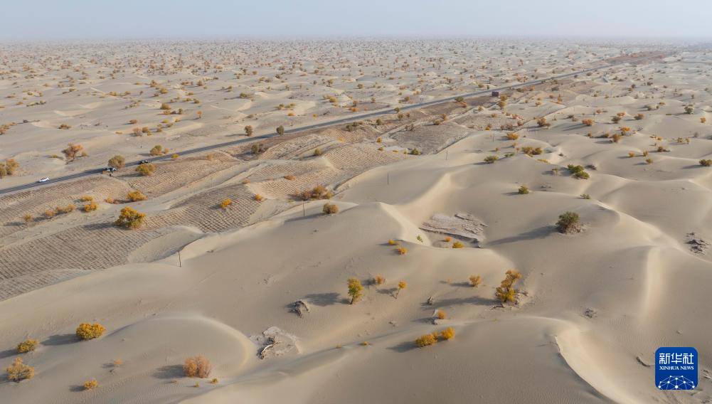 10月23日在新疆生產(chǎn)建設(shè)兵團(tuán)第一師阿拉爾市的阿拉爾至和田沙漠公路附近拍攝的胡楊林(無人機(jī)照片)。