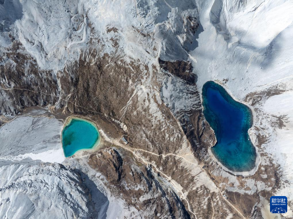 俯瞰稻城亞丁景區(qū)的五色海(右)和牛奶海(10月27日攝,無人機照片)。