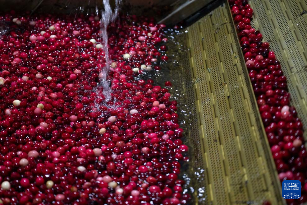 11月6日,在撫遠(yuǎn)紅海植業(yè)有限公司生產(chǎn)車(chē)間,機(jī)器對(duì)蔓越莓進(jìn)行清洗。