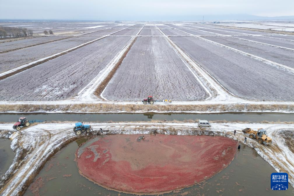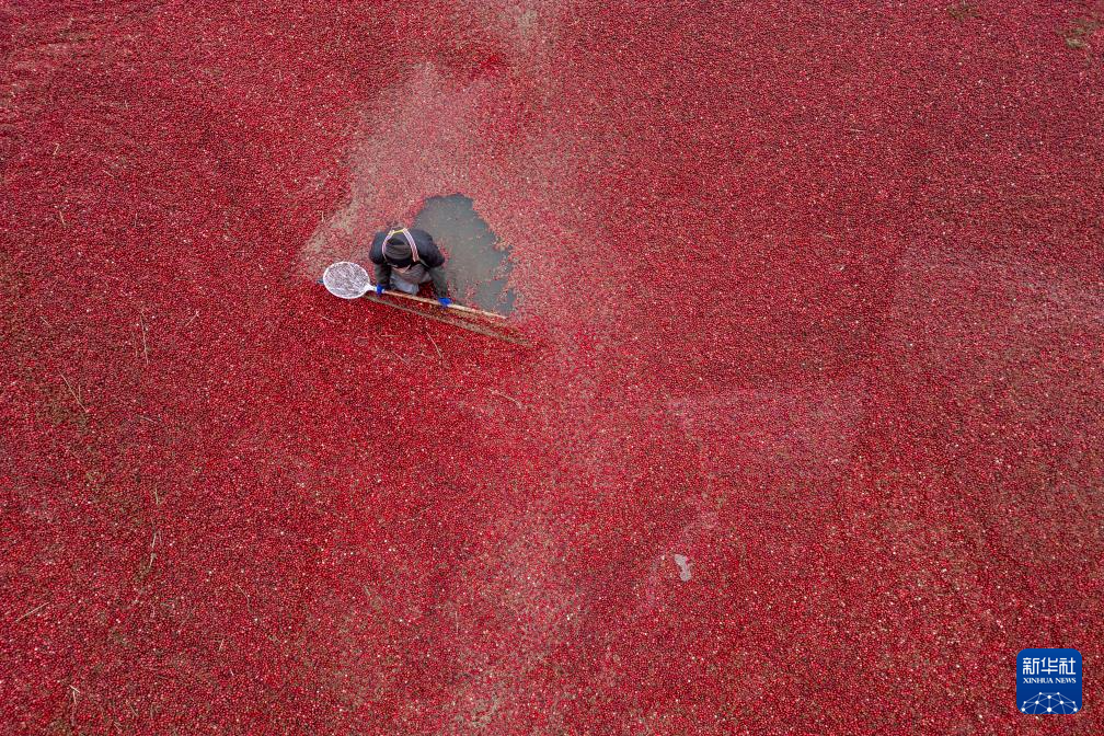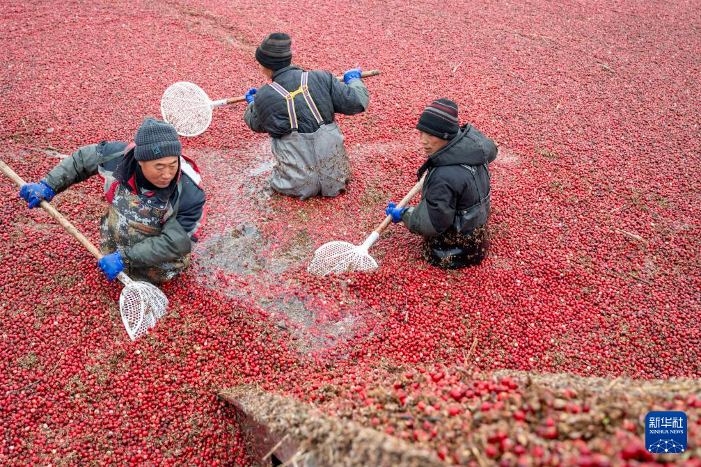 11月6日,在撫遠(yuǎn)市蔓越莓種植基地,工作人員在水中采收蔓越莓。