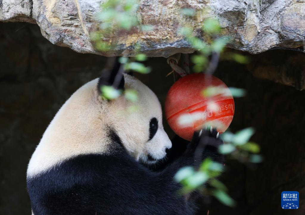 11月10日,大熊貓“怡蘭”在澳大利亞阿德萊德動(dòng)物園玩耍。