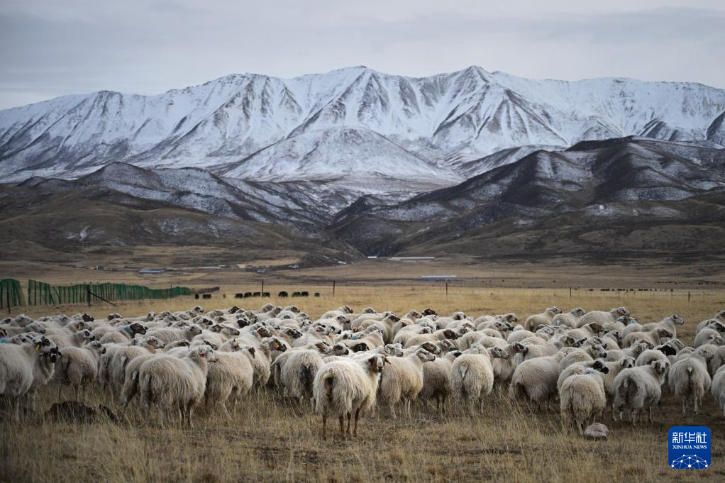 這是11月9日在青海省海北藏族自治州祁連縣仟戶牧場(chǎng)草場(chǎng)拍攝的無(wú)角藏羊羊群。