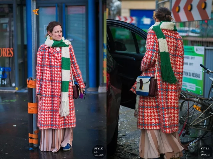 有的妹紙說格紋不好搭配,其實如果佩戴格紋圍巾,身上其他顏色就要越單一越好,這就比如你穿格子大衣,那圍巾就要純色,元素不要多,下面的示范不建議穿著,不適合日常穿搭。