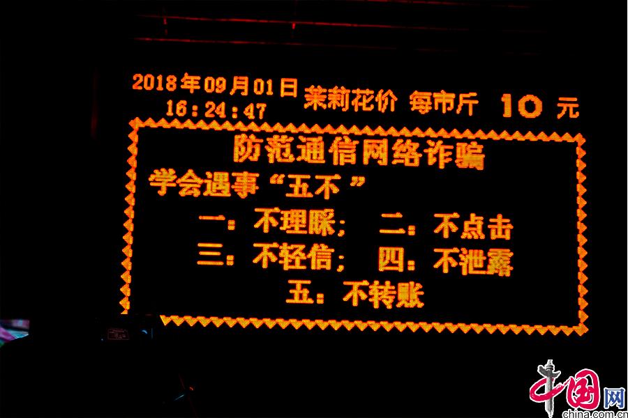 市場內(nèi)的保安會(huì)將經(jīng)銷戶給出的茉莉花浮動(dòng)價(jià)格,實(shí)時(shí)的公布在電子屏幕上。 中國網(wǎng) 李康 攝