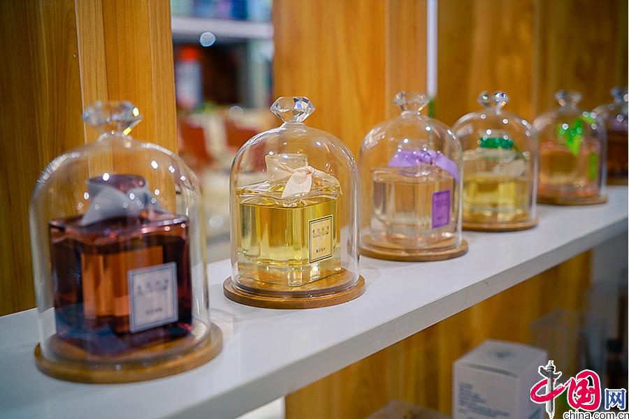 茉莉花產(chǎn)品展示廳,除了茉莉花茶、茉莉花糕外,護(hù)手霜、香薰、香包等產(chǎn)品應(yīng)有盡有。 中國網(wǎng) 李康 攝