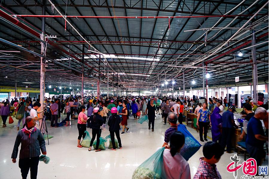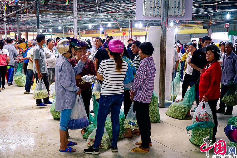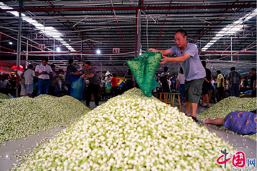 馱著大包小包茉莉花的種植戶蜂擁而至,各自奔向相熟的經(jīng)銷戶,熟練的把身上背著的裝滿新采摘茉莉花的大網(wǎng)兜往攤位秤上一扔。 中國網(wǎng) 李康 攝