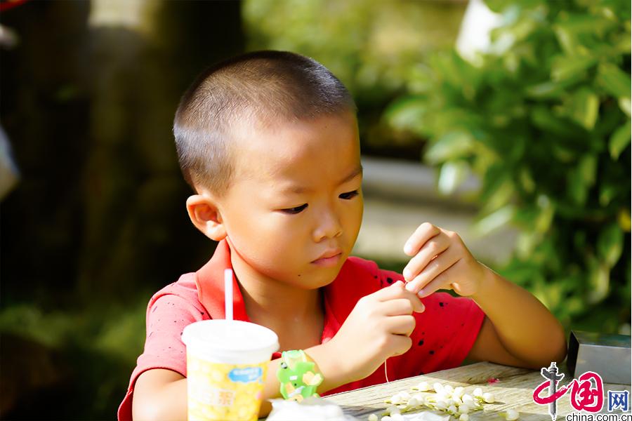 在樹上就開花的茉莉會(huì)被制作成花環(huán)、花球等飾品,圖中是正在認(rèn)真做茉莉花香球的小男孩。 中國網(wǎng) 李康 攝