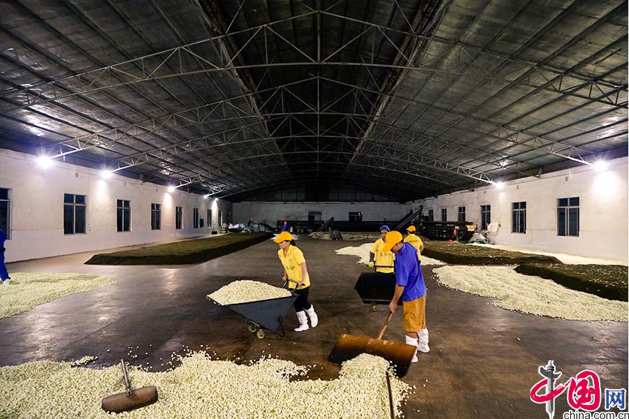 工人們將茶葉與茉莉花混合在一起,茶葉的吸附能力很強(qiáng),將兩者混合均勻,茉莉花香會(huì)融進(jìn)茶葉之中,而工人們也要根據(jù)茶葉吸收香氣的情況,進(jìn)行不同次數(shù)的翻倒。 中國網(wǎng) 李康 攝
