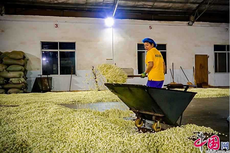 工人將開放的茉莉花裝車,準(zhǔn)備給茶葉賦香。 中國網(wǎng) 李康 攝