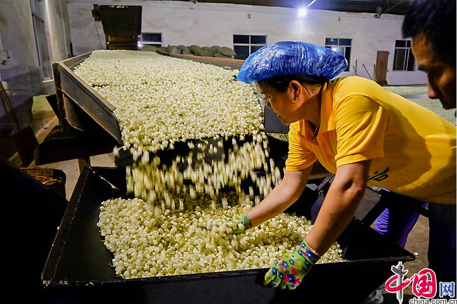 窨茶廠內(nèi),工人們正在篩選茉莉花,把那些晚上不能準(zhǔn)時(shí)開花的茉莉挑出來。不能放香的“僵花”是不能參與窨制的。 中國網(wǎng) 李康 攝