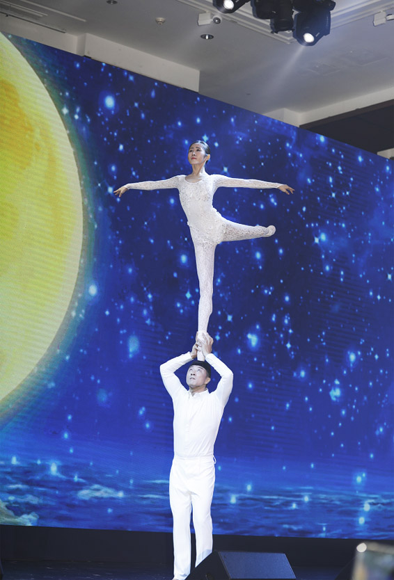 國際雜技比賽最高獎“金小丑”獎獲得者吳正丹、魏葆華夫婦肩上芭蕾展演,并講述中國藝術(shù)站上世界舞臺的故事。 (廣州市政府新聞辦公室 供圖)