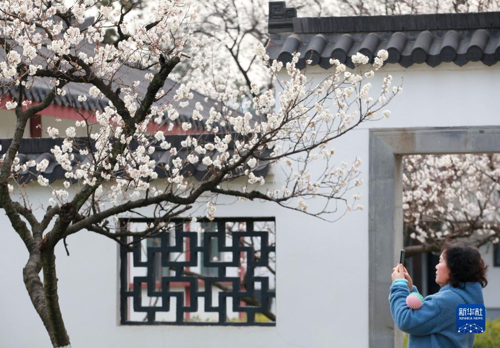 3月7日,游客在江蘇南京玄武湖櫻桃園拍攝盛開的櫻桃花。