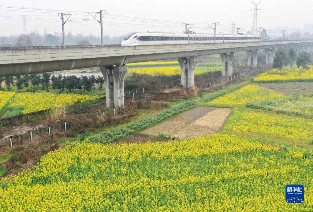3月6日,動車組列車從四川省彭州市連封村油菜花田旁駛過(無人機(jī)照片)。