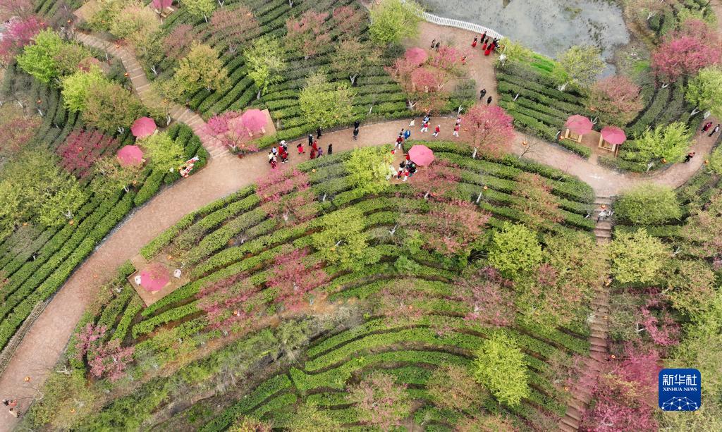 3月5日,游客在湖南省郴州市蘇仙區(qū)高椅嶺茶園踏青賞花(無人機(jī)照片)。