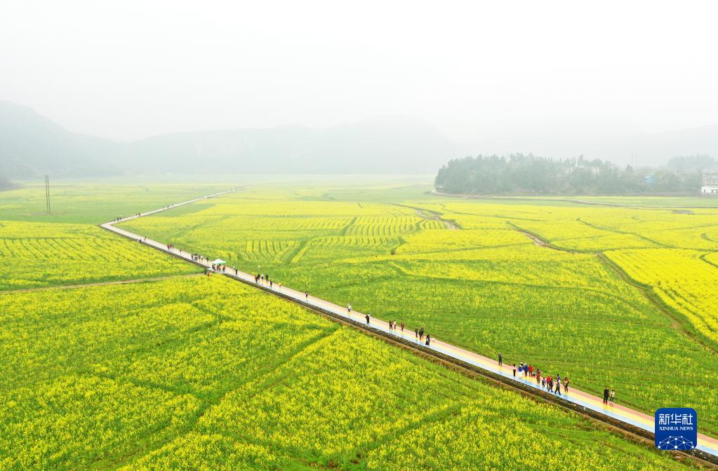 3月6日拍攝的湖南省宜章縣楊梅山鎮(zhèn)的油菜花田(3月6日攝,無人機(jī)照片)。